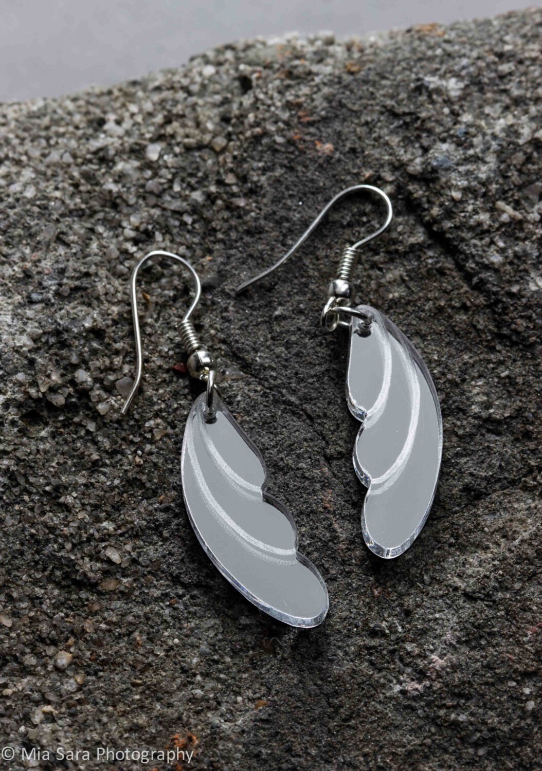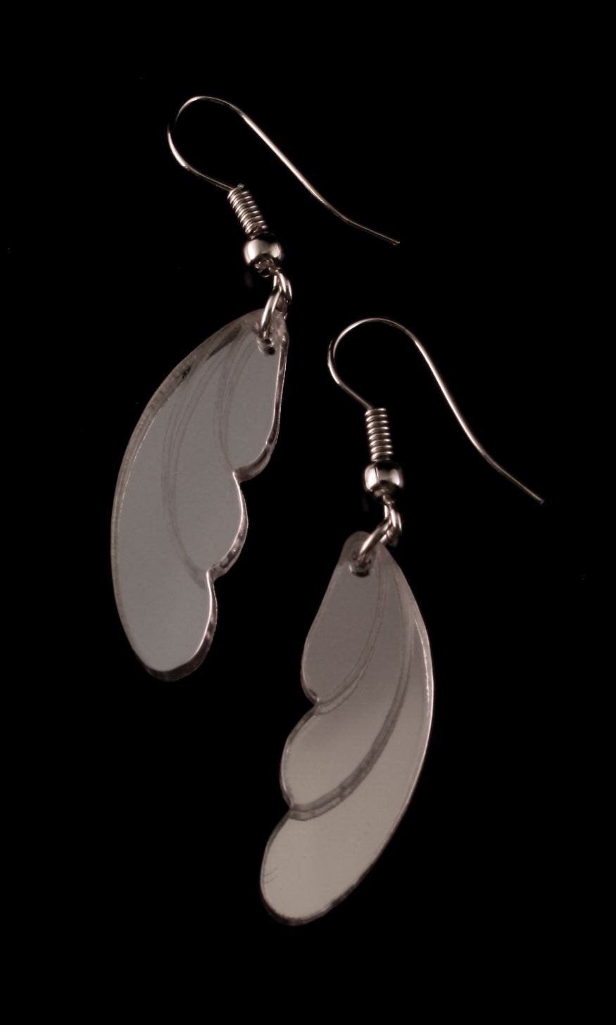 Art Deco inspired silver mirror acrylic earings. These earings have a unique quality as they magically reflect the light around you as you wear them. Striking and original whilst being an effective simple design. Designed and made by Caroline Carruthers at deccoangel.