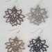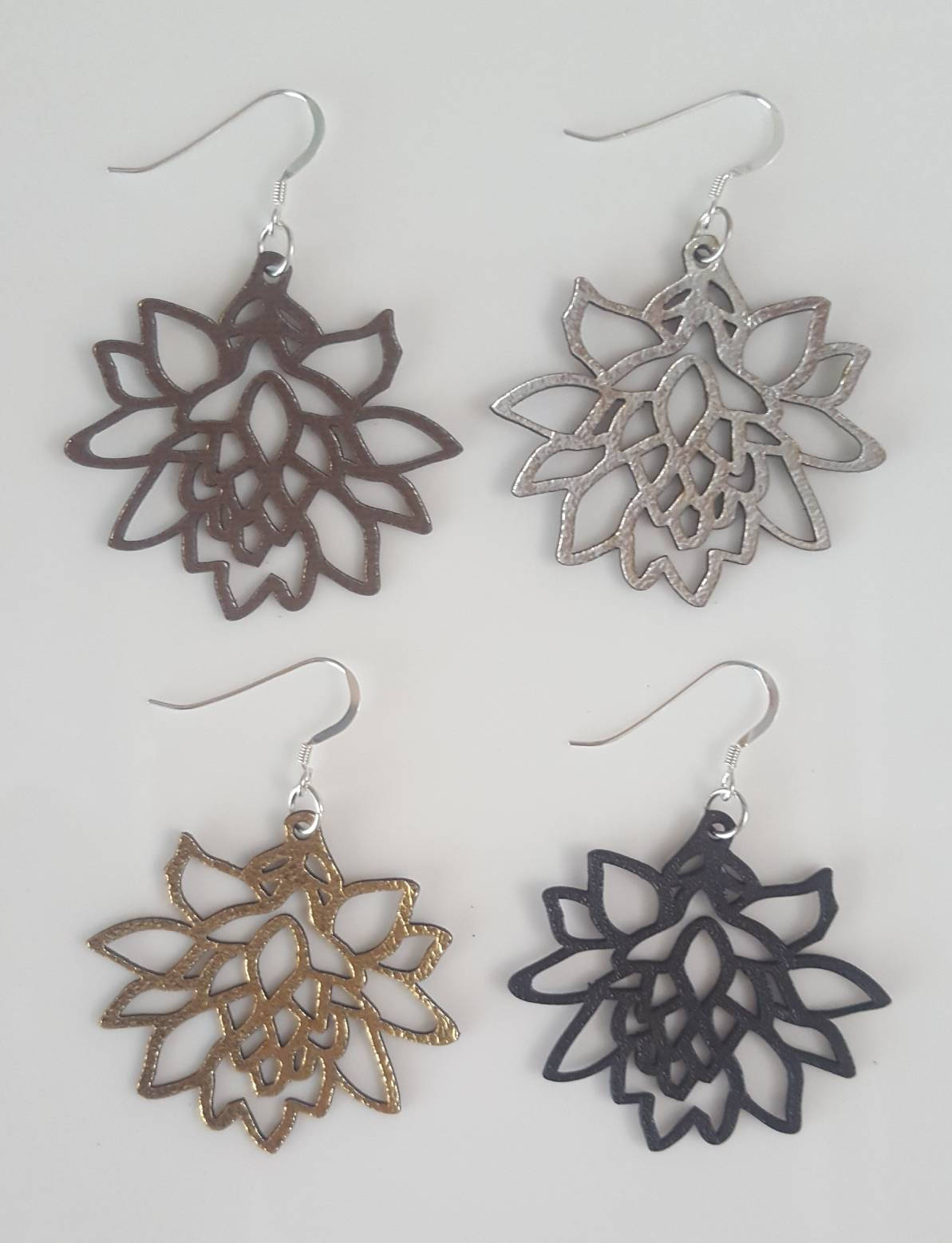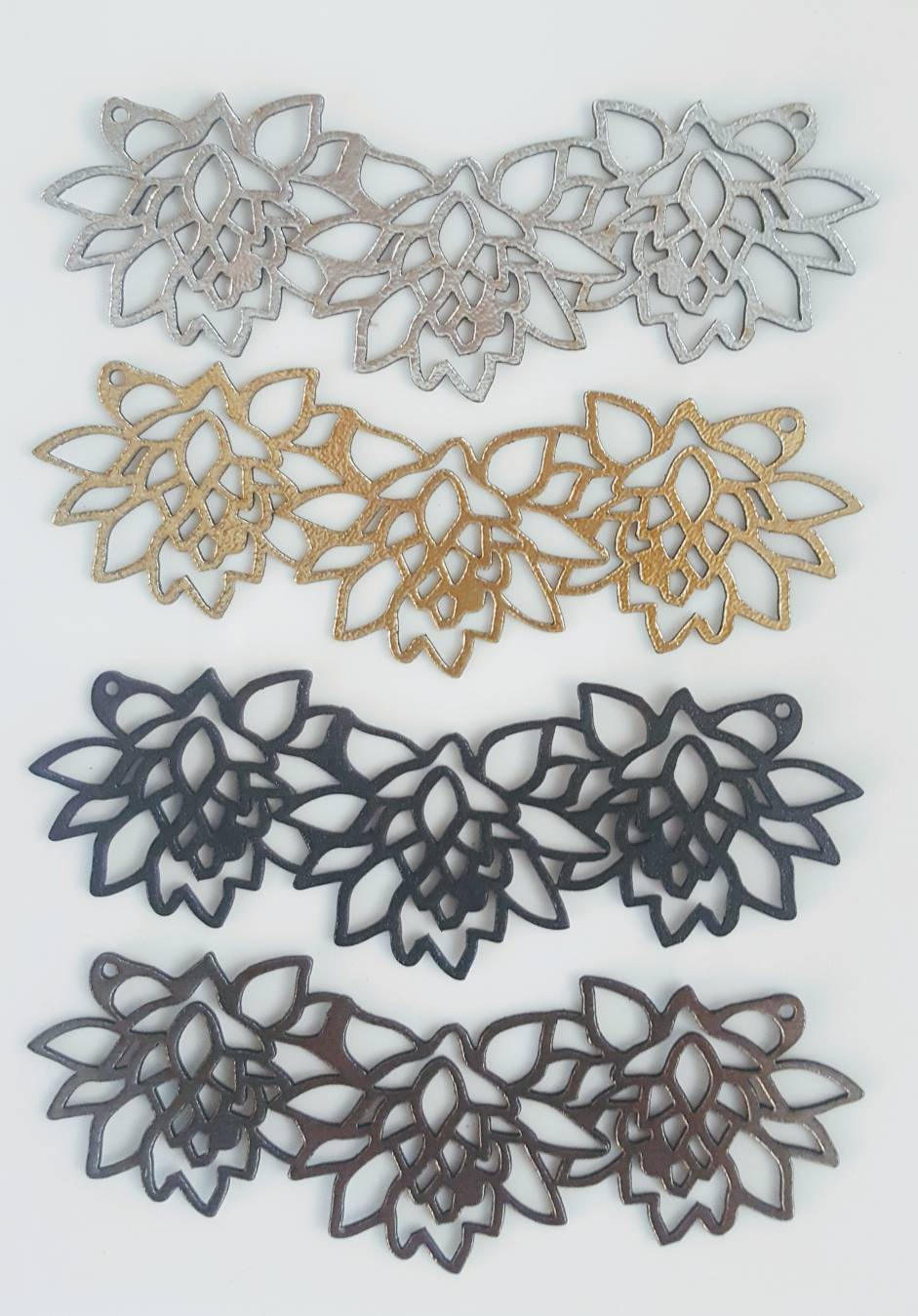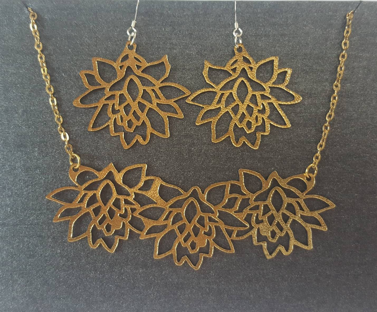 Laser cut leather necklace and earrings set. Gold, silver, pewter, black, green, aqua colour choices.