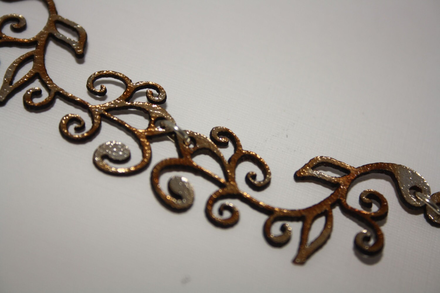 Art Nouveau inspired laser cut necklace made from 2 tone gold/silver kangaroo leather off-cuts and an up cycled gold or silver plated chain.