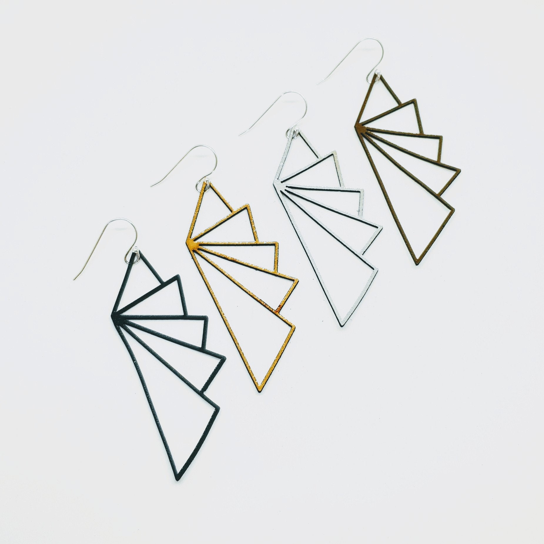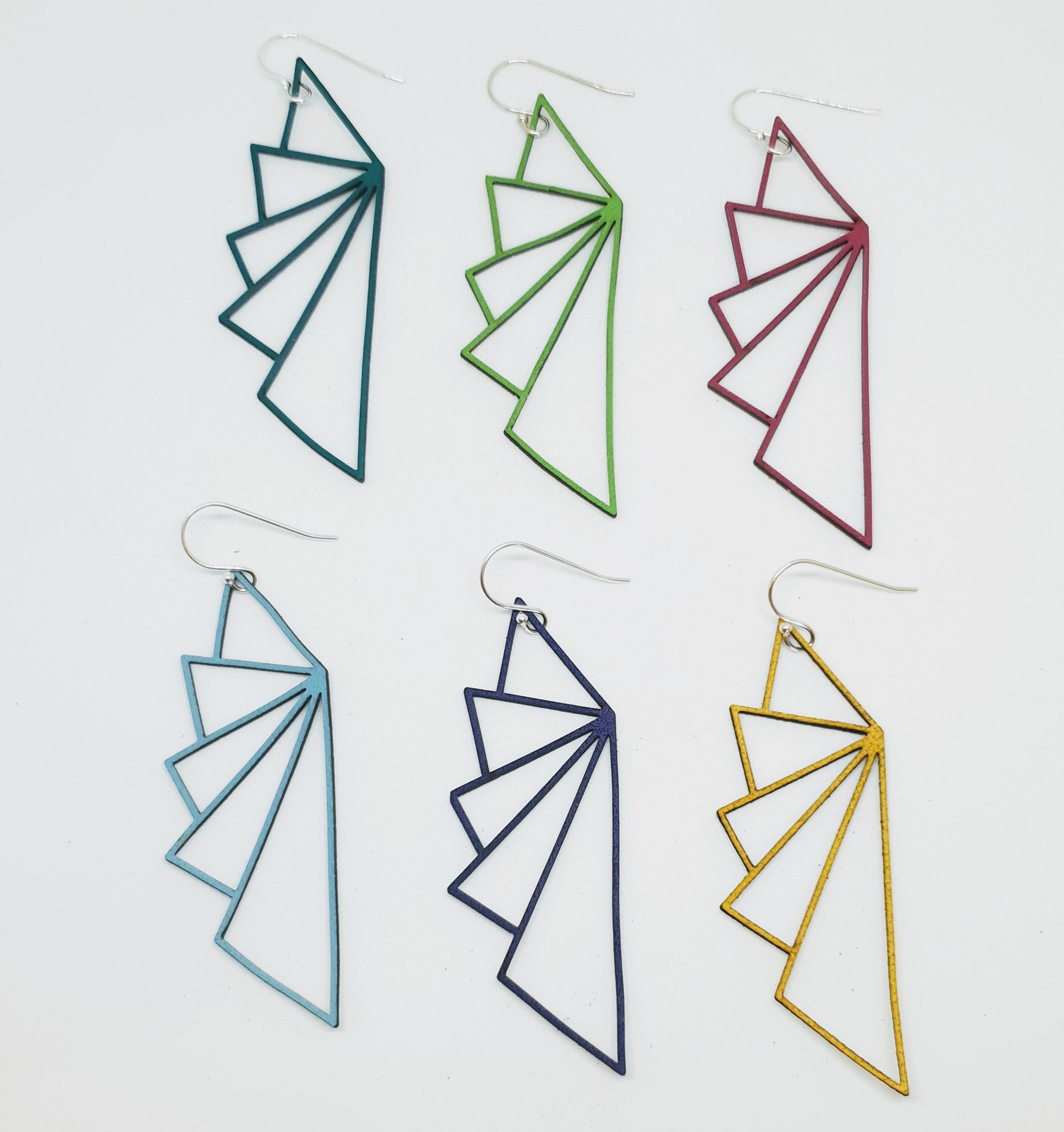 Make a statement with these stunning earrings inspired by the Deccoangel brand logo. Choose from a broad selection of colours to style your outfits. They look amazing on - striking, unique and a contemporary take on Art Deco lines and geometry. You will not feel them on as they are super lightweight and comfortable, yet strong and durable.